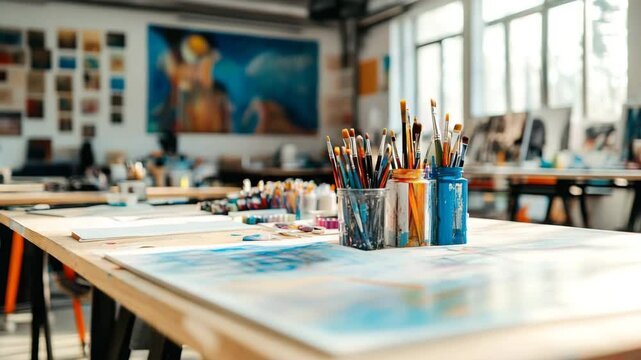 A classroom with a table full of art supplies including pencils, pens, and paintbrushes