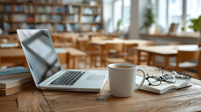 Colorful school desk with an abacus, books, stationery, and educational supplies arranged in a bright classroom