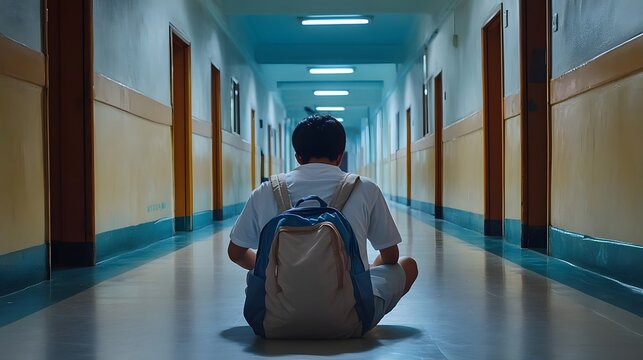 A solitary student sitting on the floor of a quiet school hallway, reflecting on studies, with empty classrooms