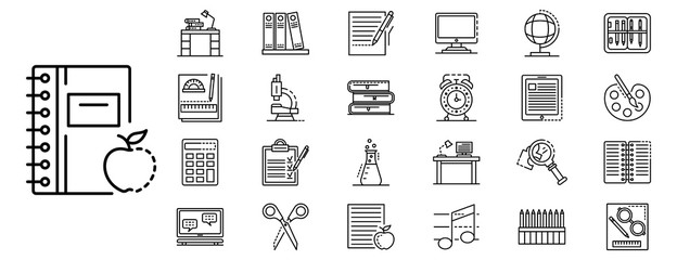 Homework icon set. Outline set of homework vector icons for web design isolated on white background