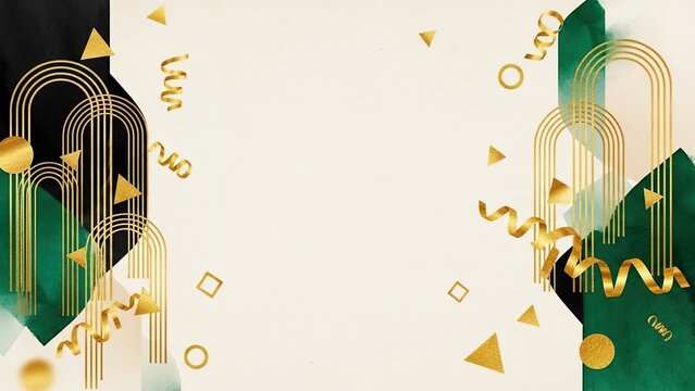 Elegant Art Deco Geometric Archways with Gold Confetti and Emerald Green Accents on a Creamy Background