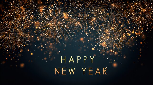 Elegant Happy New Year message in gold script typography floating on a soft neutral background with warm decorative lights. Minimal and classy holiday visual suitable for greeting cards, presentations