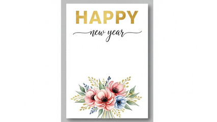 Happy New Year Greeting Card with Gold Text and Watercolor Floral Bouquet, Elegant Minimalist Holiday Printable Design