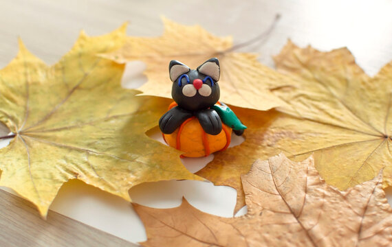 DIY dough for modeling for Halloween. Made of plasticine black cat on a pumpkin. Step-by-step instructions for photos. Step 4. The final one. Cawti is ready.