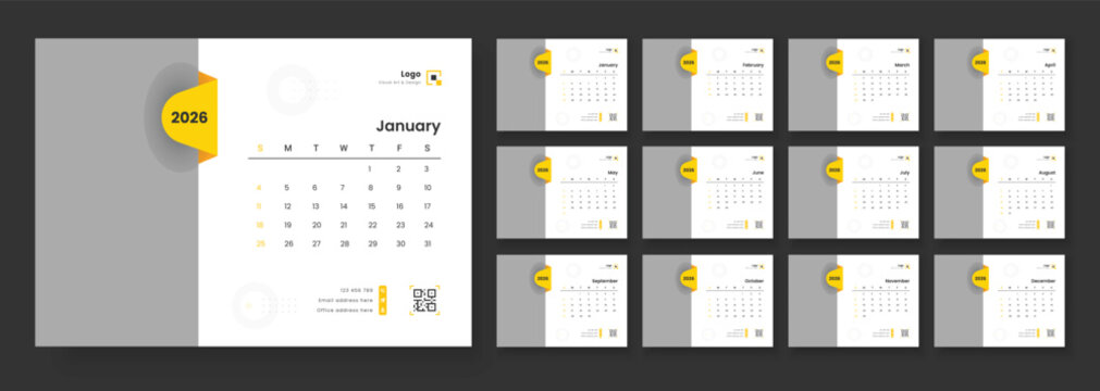 2026 Calendar Planner Set of new Template 12 Monthly Page for Corporate or Personal use. New Year 2026 table calendar, Planner simple, Stationery, printing media. Calendar template for 2026.