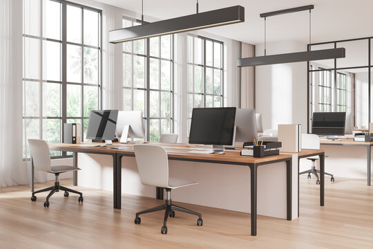 Modern office interior with wooden desks and chairs in a bright open space with large windows and natural light. 3D Rendering