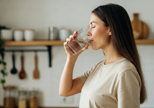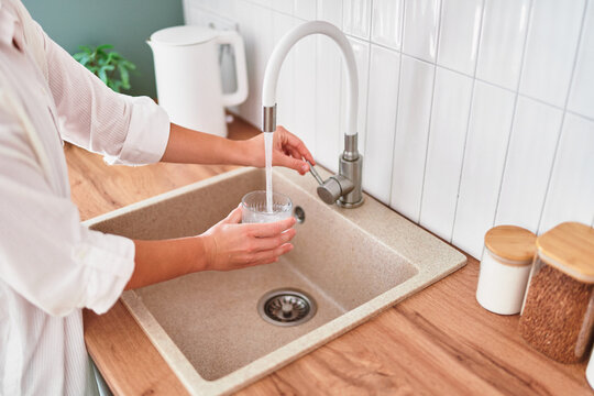 Woman fills a glass with clean filtered tap water for drinking in scandinavian style kitchen at home