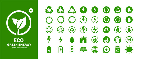"Energy efficiency icon set. Calculator, energy-saving light bulb, piggy bank, solar panel, circular economy, battery, home insulation, energy class vector illustration.