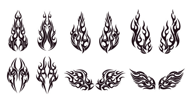 Minimalist fire flame vector icons set with stylized, layered, and abstract burning designs