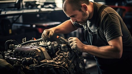 Auto technician works to repair the car's fuel injection system, inspecting and cleaning injectors, and ensuring smooth engine operation and reduced emissions. Generated by AI.