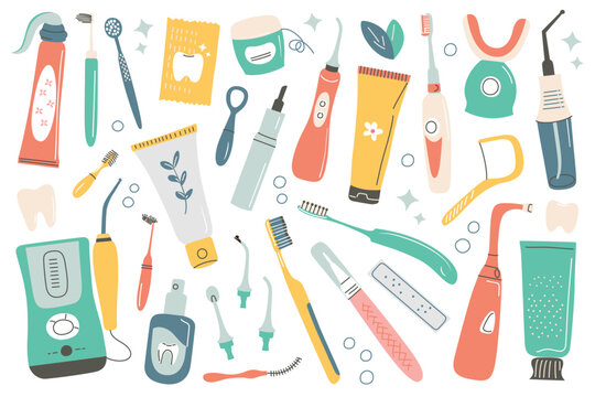 Vector illustration set of dental care items, collection of toothbrushes, toothpaste, floss, water flosser. Flat cartoon style, perfect for hygiene, health, and oral care themes