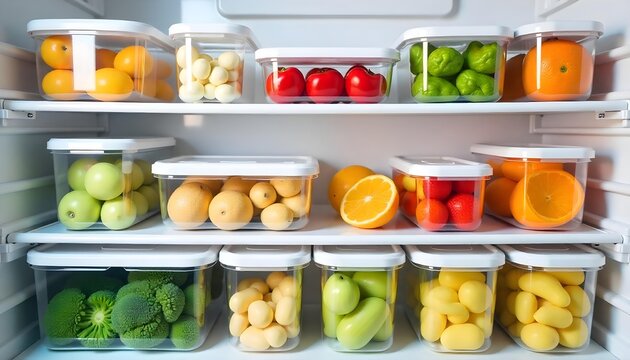 Organized refrigerator interior featuring labeled containers and fresh ingredients neatly arranged on clean shelves, symbolizing smart food storage, meal planning,modern kitchen hygiene safety concept
