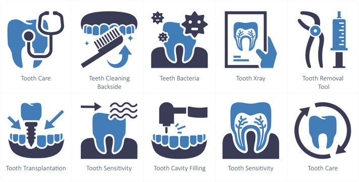 A set of 10 mix icons as tooth care, teeth cleaning backside, teeth bacteria