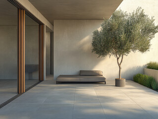Modern outdoor lounge area with olive tree and minimalist design in bright sunlight