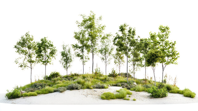 A collection of trees and shrubs on a small mound, featuring lush greenery and vibrant foliage, isolated on a clean white background.