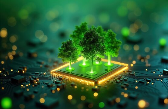 Green trees grow on tech circuit board. Eco-friendly tech concept. Sustainable future. Illustration shows computer chip with glowing green trees. New eco-friendly tech. Modern tech, nature coming