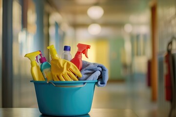 Cleaning supplies in a bucket, store background