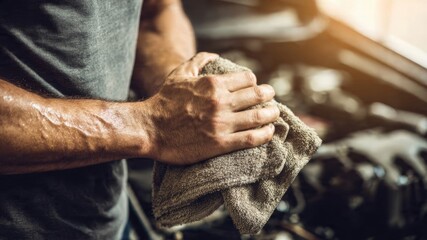 Mechanic cleaning hands after car repair garage closeup image sunlit environment natural tone