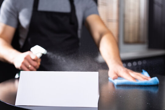 Male cleaning. Covid-19 disease prevention. Disinfectant spray, wipes of desk at home or workplace for safety. Infection of virus, germs. Area frequently touched. White blank space for info, ads