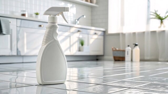 Blank white spray bottle mockup on clean kitchen tile floor, cleaning product packaging template for branding, household disinfectant cleaner display