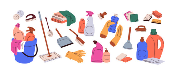 Cleaning supplies set. Home chemical detergent in bottles, household tools, equipment. Brush, mop and gloves, housework accessories. Flat graphic vector illustrations isolated on white background