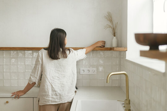 Rags, natural sponges and cleaning products on wooden table. Modern kitchen interior on background. House cleaning concept