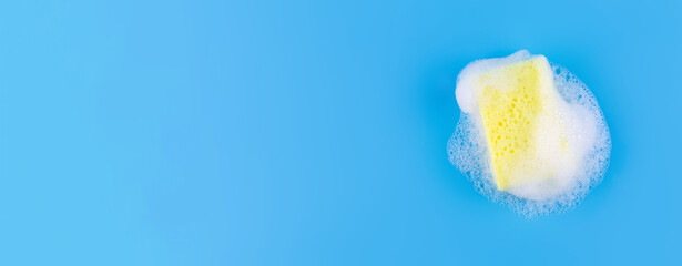 Cleaning yellow sponge and a soapy bubble foam on a blue background. Cleaning concept, cleaning service. Banner. Flat lay, top view