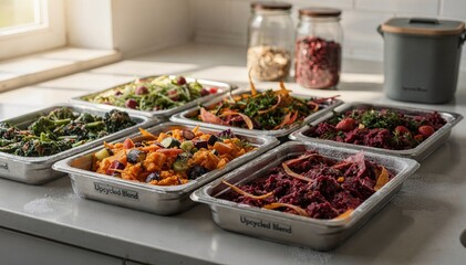 A serene park scene featuring rain-soaked trash bins lined along a pathway, surrounded by lush greenery under soft sunlight.