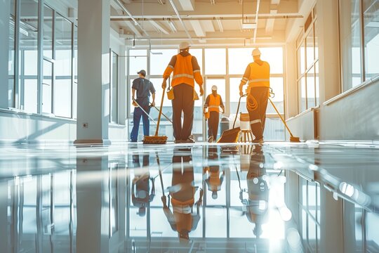 Commercial cleaning team in action with mop on glossy floor