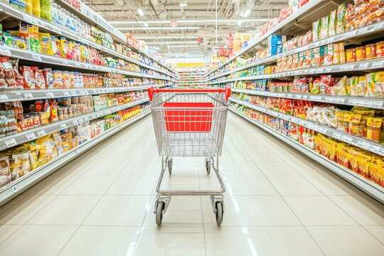 Empty grocery shopping cart in the middle of a wide, clean store aisle, with space above for text, bright lighting, polished floor, perfect for commercial use in grocery store ads.