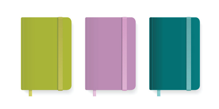 Realistic Detailed 3d Color Copybook Template with Elastic Band and Bookmark Set for Office Information. Vector illustration