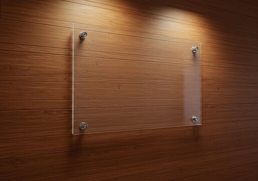 Blank clear acrylic sign mounted on warm wood grain wall. Ideal for business logos, directional signs, and personalized messages.