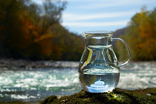 A clear glass pitcher pouring water with sunlight creating a refreshing and natural outdoor scene image