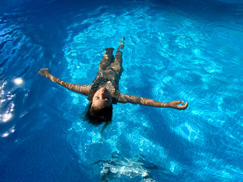 Woman relaxing in clear pool water in hot sunny day on Bali villa