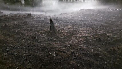 Aerial of broken cracked tree stump in clearcut field on foggy morning