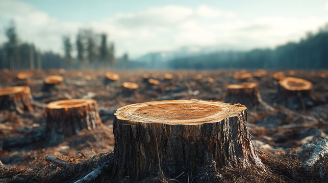 Deforestation scene with tree stumps in a barren landscape, highlighting environmental destruction, forest clearing, and the impact of human activities on nature