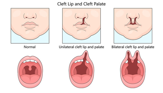 normal, unilateral cleft lip and palate, and bilateral cleft lip and palate conditions in infants diagram hand drawn schematic raster illustration. Medical science educational illustration