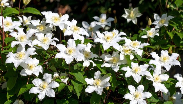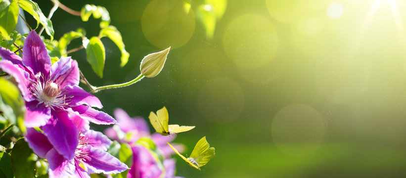 Purple clematis flowers blooming on shrub in sunlight. Spring garden in blossom.