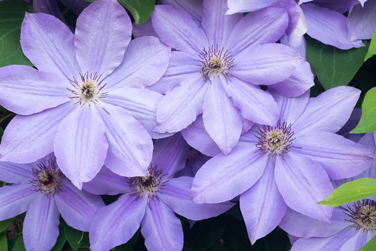 Many large purple clematis flowers on a background of green leaves. Close-up.