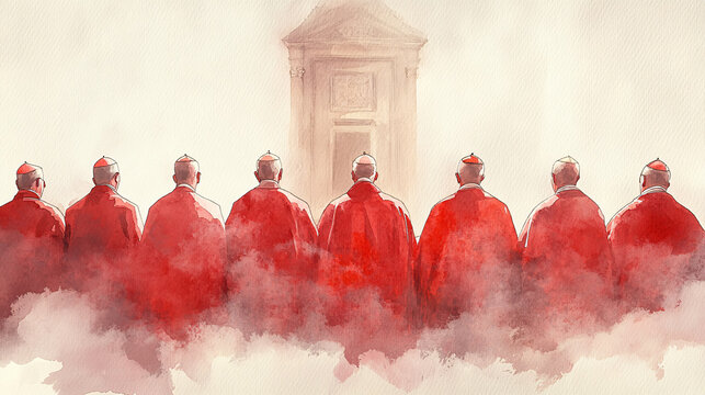 catholic conclave with red robed clergy in ceremonial hall, cardinals in formal religious assembly, abstract painting of papal election in grand cathedral architecture