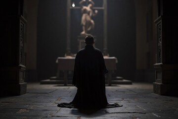 cleric kneeling in Gothicstyle church facing ornate altar