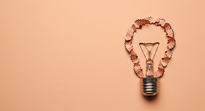 Cleverly crafted light bulb symbol made from natural pencil shavings, representing bright ideas, innovation, and creative solutions