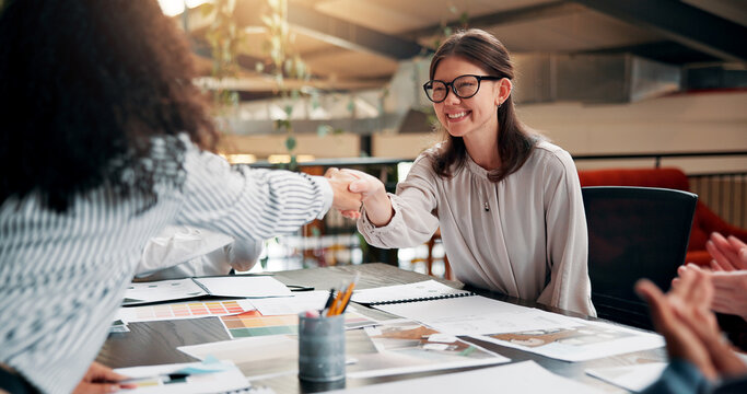 Interior designer, people or handshake with partnership in office for renovation contract, deal or b2b onboarding. Applause, documents or client with celebration for design proposal approval or offer