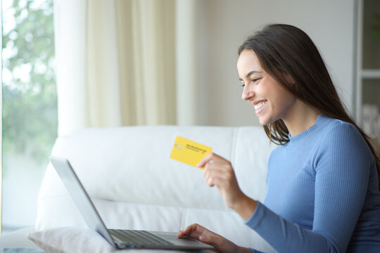 Photo portrait of girl holding credit card looking at blank space isolated on bright yellow colored background