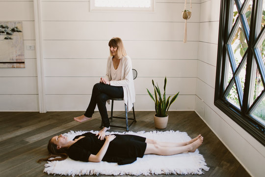 Hands of female chiropractor massaging shoulders of young woman lying on massage table. Concept of physical therapy treatment ,neck pressure point