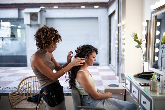 Side view portrait of positive beautician talking with client pinching eyebrows shaping form. Charming Caucasian women chatting doing procedure in beauty spa indoors