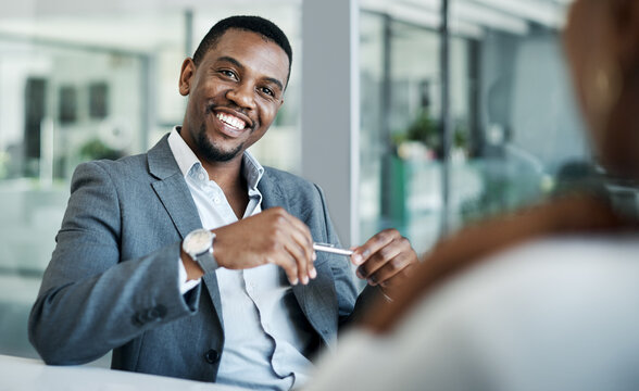 Talking, office and business black man in meeting with client for networking, planning and partnership. Corporate attorney, company and lawyer in discussion, conversation and consulting for contract