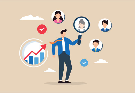 Flat illustration of businessman with magnifying glass focuses on users or client illustrating customer centric marketing strategy