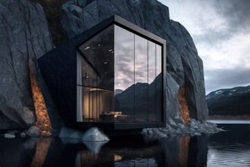 A futuristic cubic luxury house on a cliff overlooking the sea, generative ai