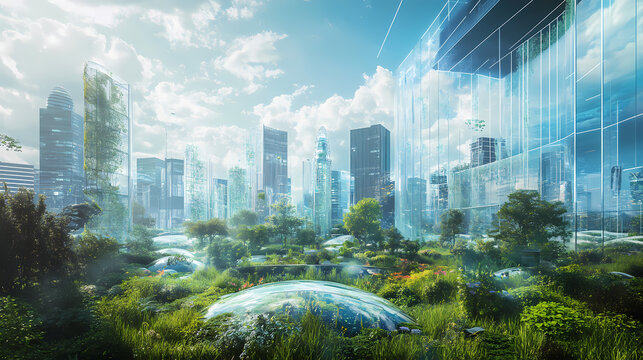 Innovative urban landscape showcasing buildings that integrate elastocaloric cooling systems. Their distinct design compared to conventional AC units. Sustainable solution to climate challenges.